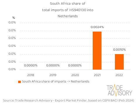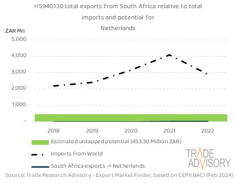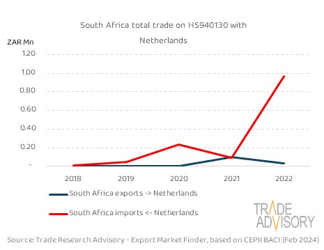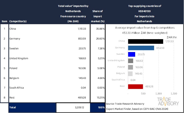 This report contains a summary snapshot of outcomes for the exports of HS940130 to Netherlands from the perspective of the home market (South Africa). More technical detail is available on request from Trade Research Advisory.