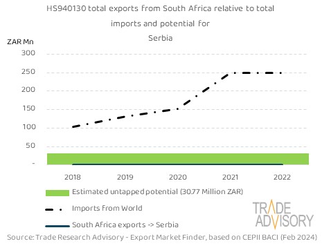 This report contains a summary snapshot of outcomes for the exports of HS940130 to Serbia from the perspective of the home market (South Africa). More technical detail is available on request from Trade Research Advisory.