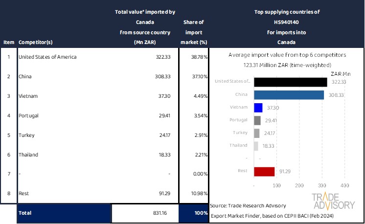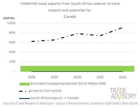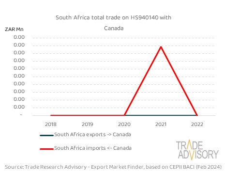 This report contains a summary snapshot of outcomes for the exports of HS940140 to Canada from the perspective of the home market (South Africa). More technical detail is available on request from Trade Research Advisory.