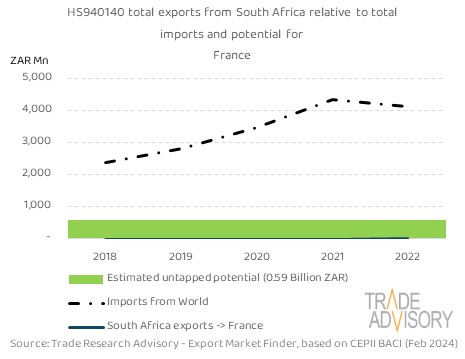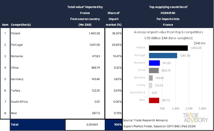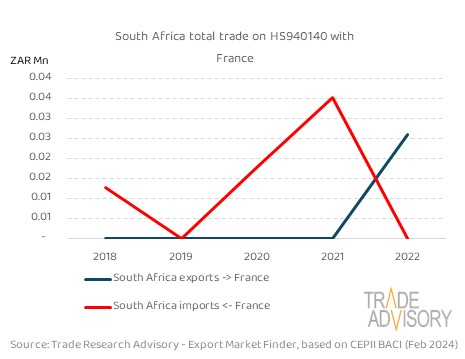 This report contains a summary snapshot of outcomes for the exports of HS940140 to France from the perspective of the home market (South Africa). More technical detail is available on request from Trade Research Advisory.