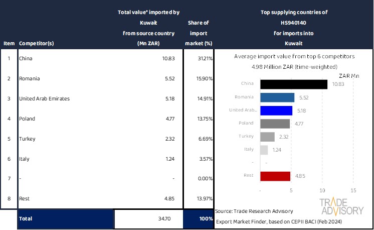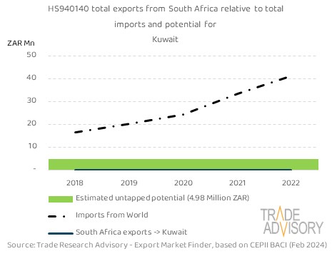 This report contains a summary snapshot of outcomes for the exports of HS940140 to Kuwait from the perspective of the home market (South Africa). More technical detail is available on request from Trade Research Advisory.