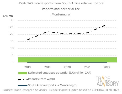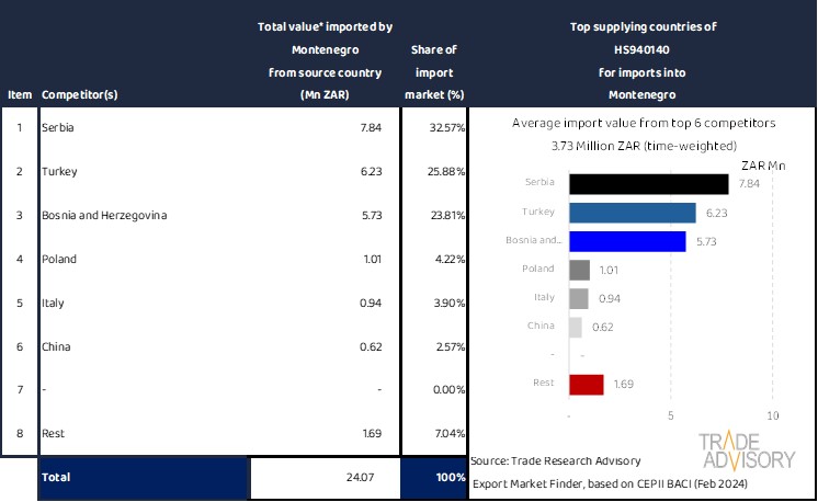 This report contains a summary snapshot of outcomes for the exports of HS940140 to Montenegro from the perspective of the home market (South Africa). More technical detail is available on request from Trade Research Advisory.