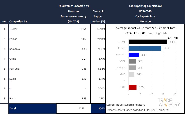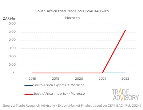 This report contains a summary snapshot of outcomes for the exports of HS940140 to Morocco from the perspective of the home market (South Africa). More technical detail is available on request from Trade Research Advisory.