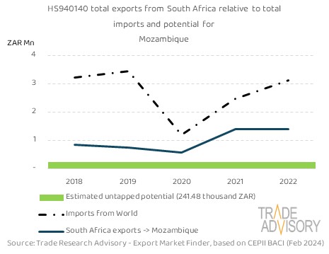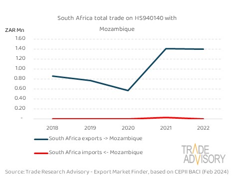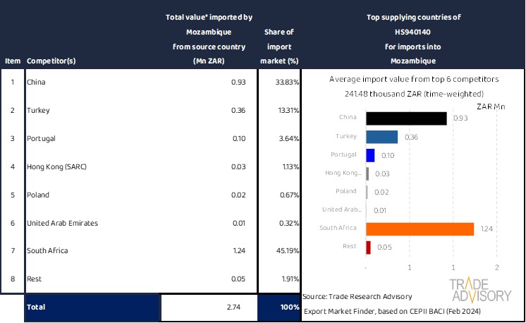 This report contains a summary snapshot of outcomes for the exports of HS940140 to Mozambique from the perspective of the home market (South Africa). More technical detail is available on request from Trade Research Advisory.