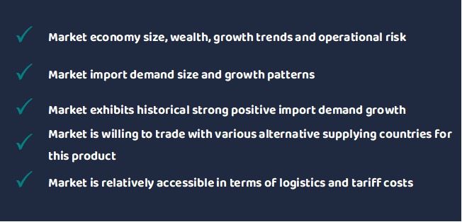 The results provided for this market and product combination is based on the analysis that underpins the outcomes of the study commissioned by SAFI (conducted in 2024). The study is based on Trade Advisory’s Export Market Finder international trade modelling platform that generates product-specific global market intelligence for exporters.