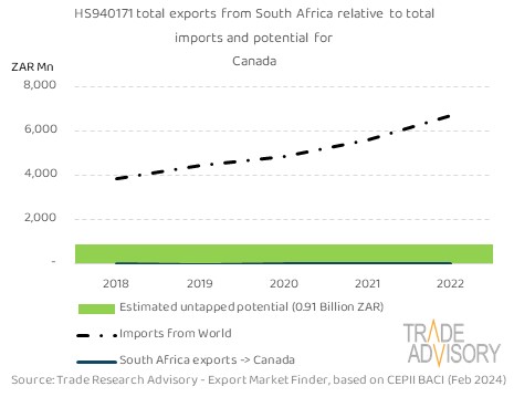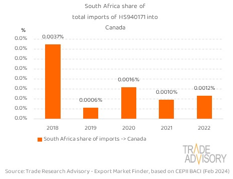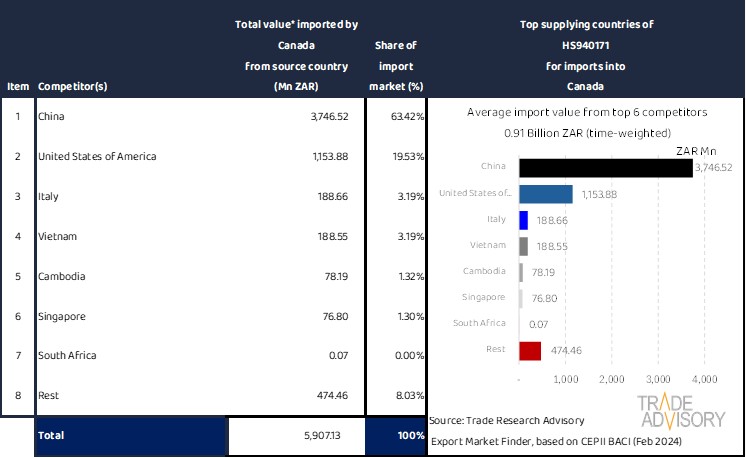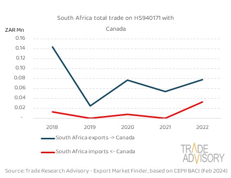 This report contains a summary snapshot of outcomes for the exports of HS940171 to Canada from the perspective of the home market (South Africa). More technical detail is available on request from Trade Research Advisory.