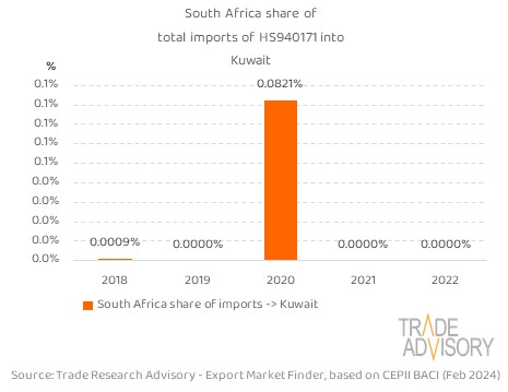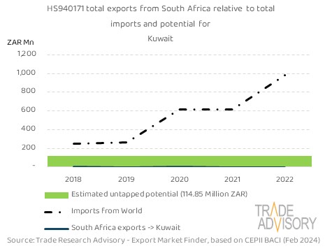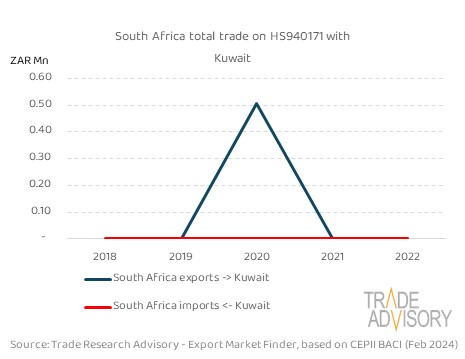 This report contains a summary snapshot of outcomes for the exports of HS940171 to Kuwait from the perspective of the home market (South Africa). More technical detail is available on request from Trade Research Advisory.