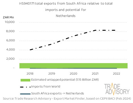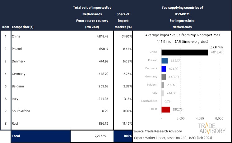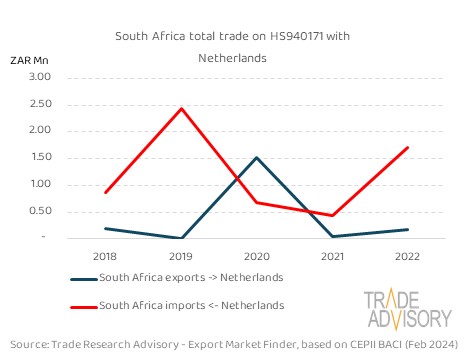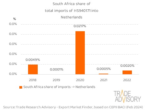 This report contains a summary snapshot of outcomes for the exports of HS940171 to Netherlands from the perspective of the home market (South Africa). More technical detail is available on request from Trade Research Advisory.