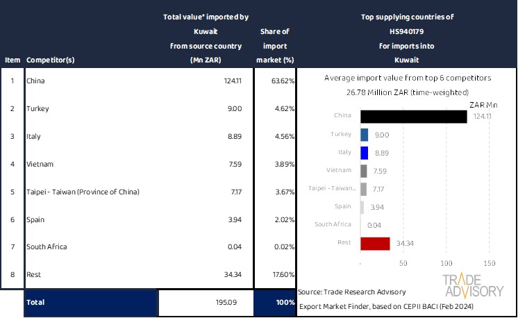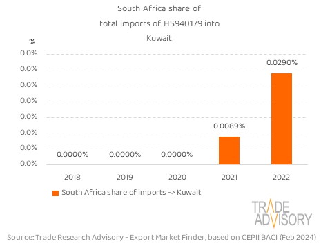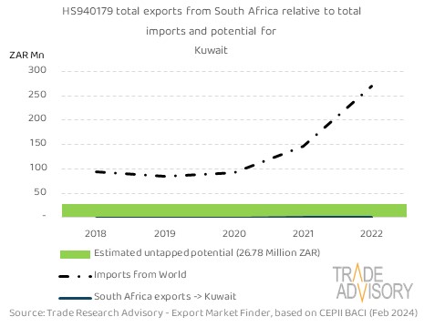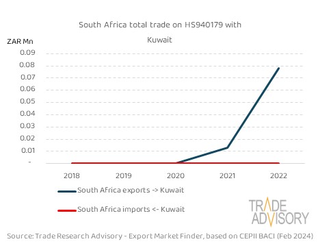 This report contains a summary snapshot of outcomes for the exports of HS940179 to Kuwait from the perspective of the home market (South Africa). More technical detail is available on request from Trade Research Advisory.