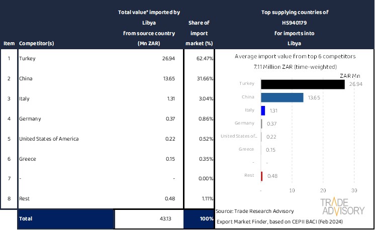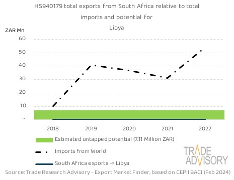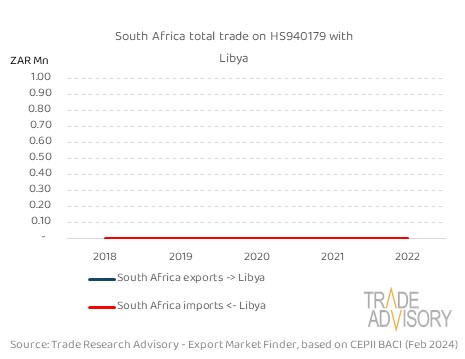 This report contains a summary snapshot of outcomes for the exports of HS940179 to Libya from the perspective of the home market (South Africa). More technical detail is available on request from Trade Research Advisory.