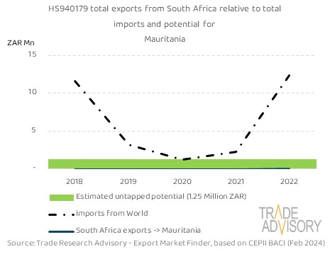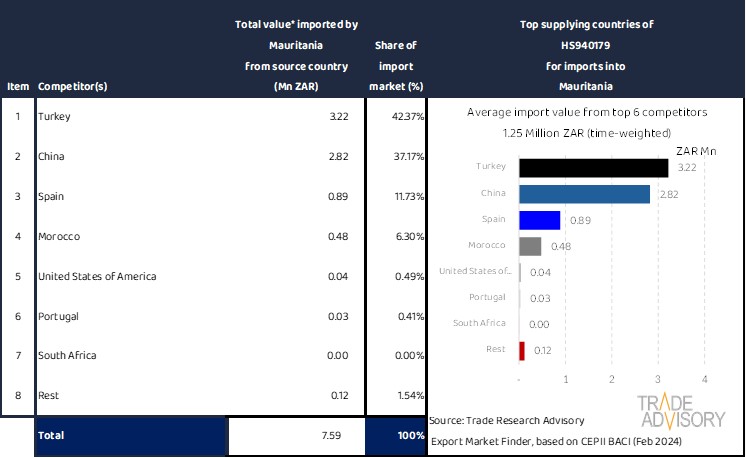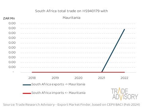 This report contains a summary snapshot of outcomes for the exports of HS940179 to Mauritania from the perspective of the home market (South Africa). More technical detail is available on request from Trade Research Advisory.