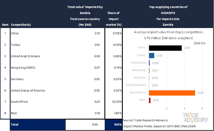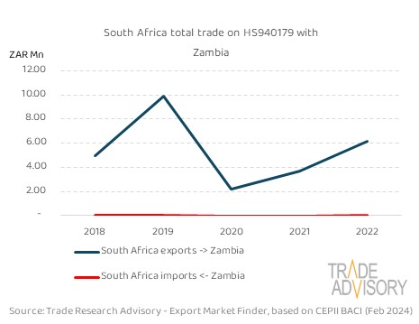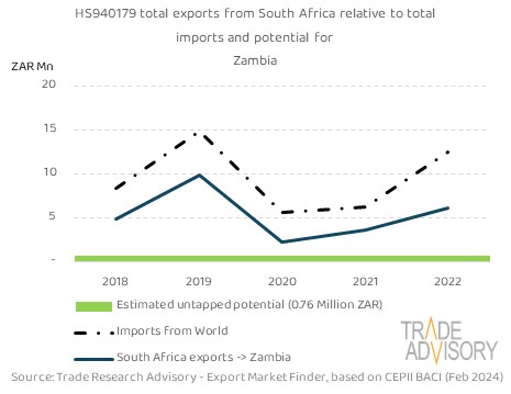This report contains a summary snapshot of outcomes for the exports of HS940179 to Zambia from the perspective of the home market (South Africa). More technical detail is available on request from Trade Research Advisory.