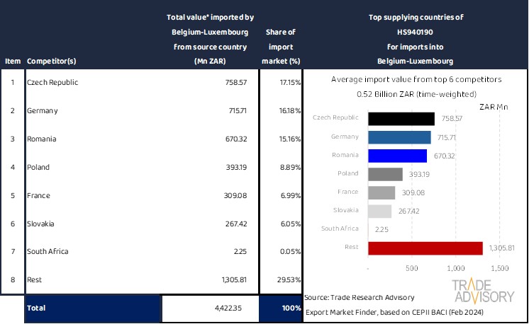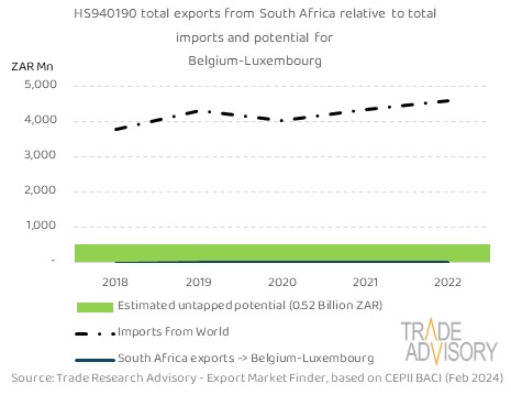 This report contains a summary snapshot of outcomes for the exports of HS940190 to Belgium-Luxembourg from the perspective of the home market (South Africa). More technical detail is available on request from Trade Research Advisory.
