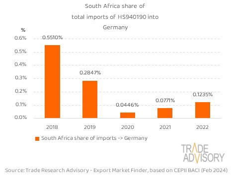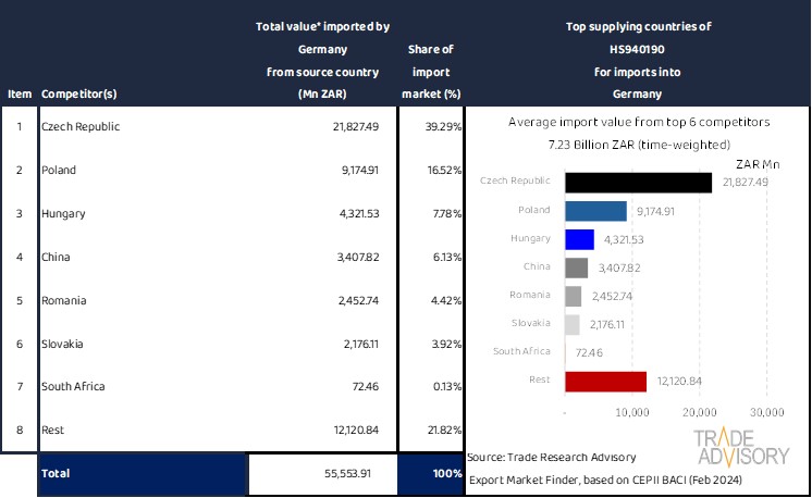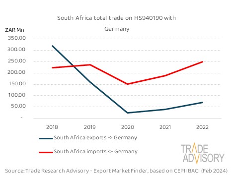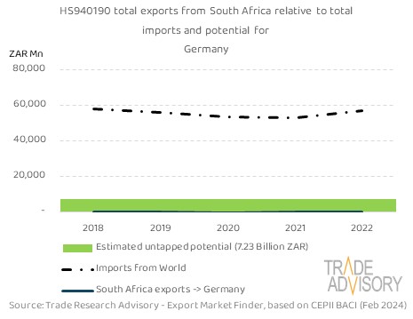 This report contains a summary snapshot of outcomes for the exports of HS940190 to Germany from the perspective of the home market (South Africa). More technical detail is available on request from Trade Research Advisory.