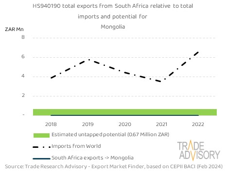 This report contains a summary snapshot of outcomes for the exports of HS940190 to Mongolia from the perspective of the home market (South Africa). More technical detail is available on request from Trade Research Advisory.