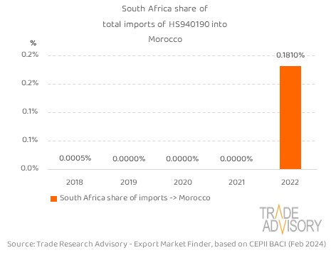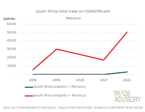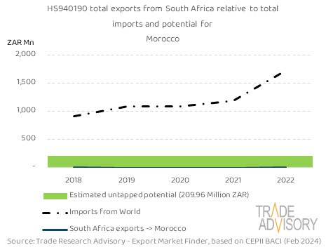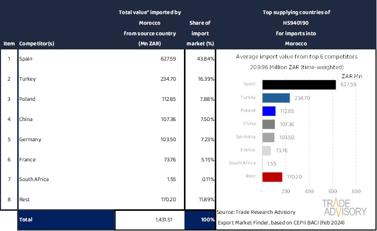 This report contains a summary snapshot of outcomes for the exports of HS940190 to Morocco from the perspective of the home market (South Africa). More technical detail is available on request from Trade Research Advisory.