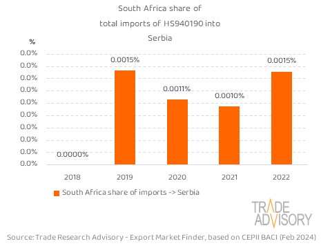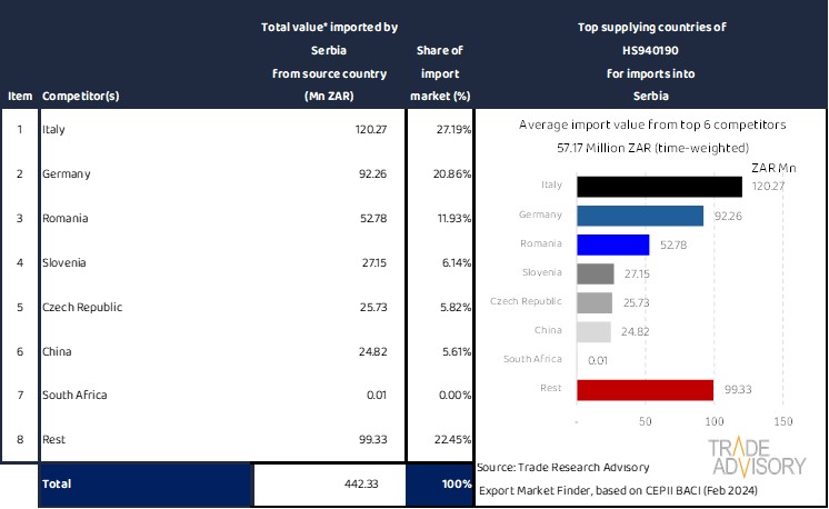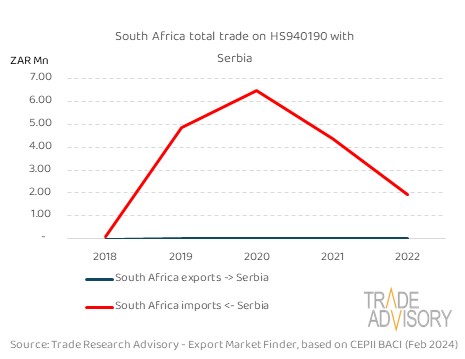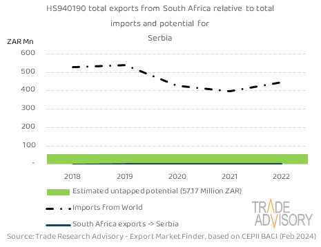 This report contains a summary snapshot of outcomes for the exports of HS940190 to Serbia from the perspective of the home market (South Africa). More technical detail is available on request from Trade Research Advisory.