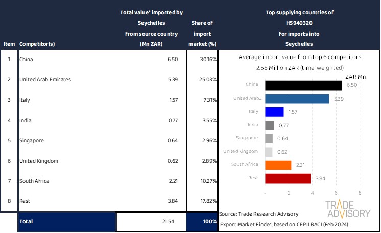 This report contains a summary snapshot of outcomes for the exports of HS940320 to Seychelles from the perspective of the home market (South Africa). More technical detail is available on request from Trade Research Advisory.