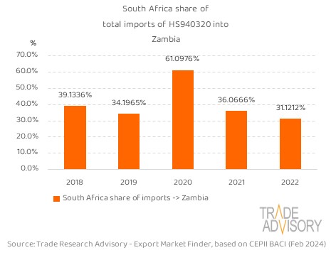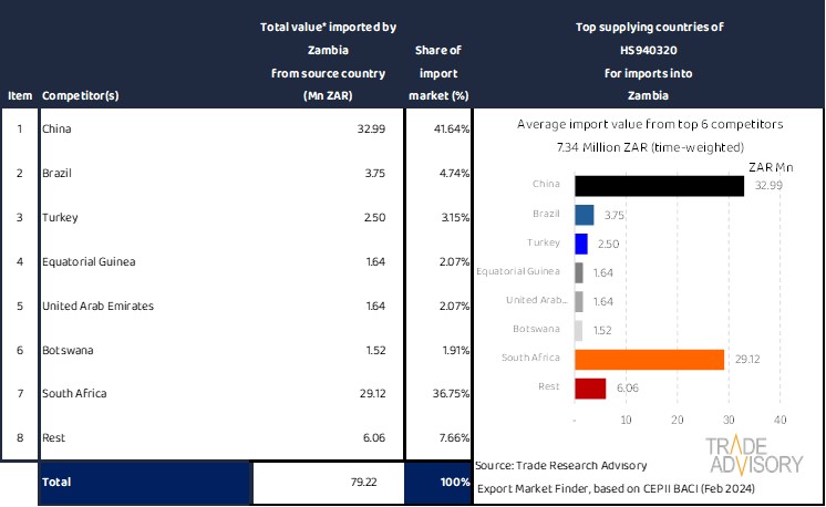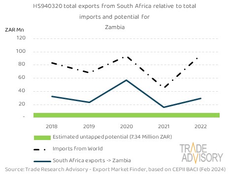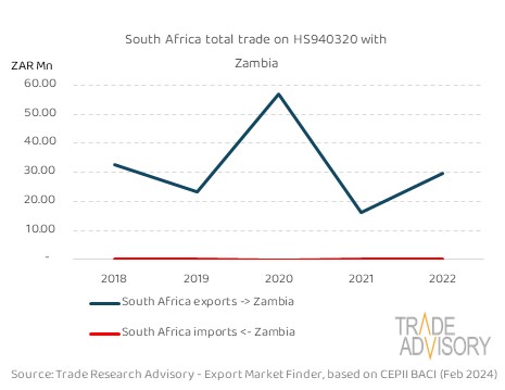 This report contains a summary snapshot of outcomes for the exports of HS940320 to Zambia from the perspective of the home market (South Africa). More technical detail is available on request from Trade Research Advisory.