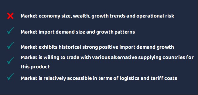 The results provided for this market and product combination is based on the analysis that underpins the outcomes of the study commissioned by SAFI (conducted in 2024). The study is based on Trade Advisory’s Export Market Finder international trade modelling platform that generates product-specific global market intelligence for exporters.