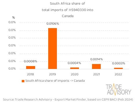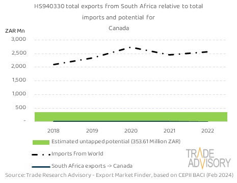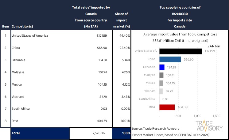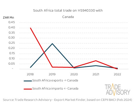 This report contains a summary snapshot of outcomes for the exports of HS940330 to Canada from the perspective of the home market (South Africa). More technical detail is available on request from Trade Research Advisory.