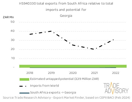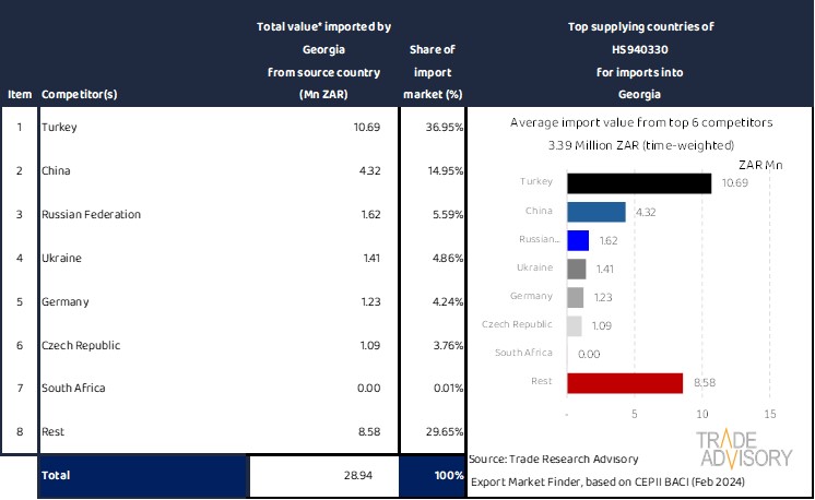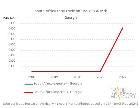 This report contains a summary snapshot of outcomes for the exports of HS940330 to Georgia from the perspective of the home market (South Africa). More technical detail is available on request from Trade Research Advisory.