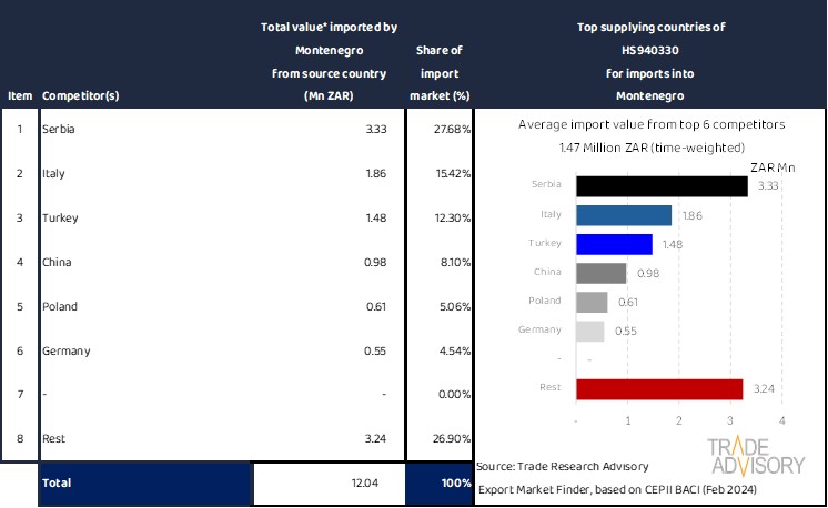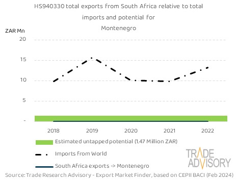 This report contains a summary snapshot of outcomes for the exports of HS940330 to Montenegro from the perspective of the home market (South Africa). More technical detail is available on request from Trade Research Advisory.