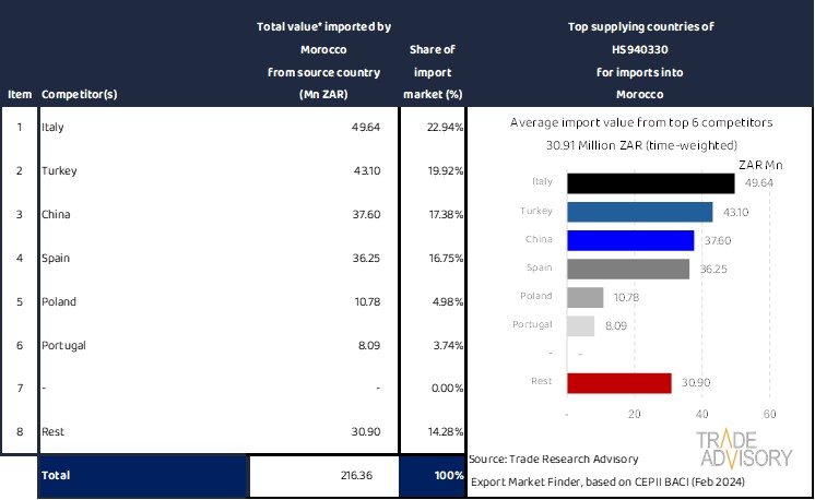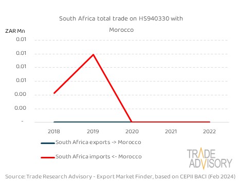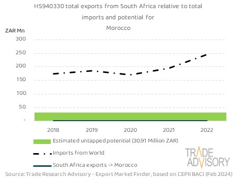 This report contains a summary snapshot of outcomes for the exports of HS940330 to Morocco from the perspective of the home market (South Africa). More technical detail is available on request from Trade Research Advisory.