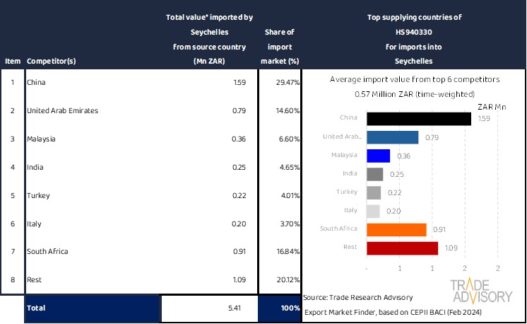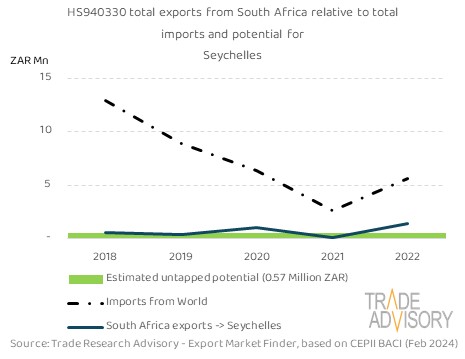 This report contains a summary snapshot of outcomes for the exports of HS940330 to Seychelles from the perspective of the home market (South Africa). More technical detail is available on request from Trade Research Advisory.