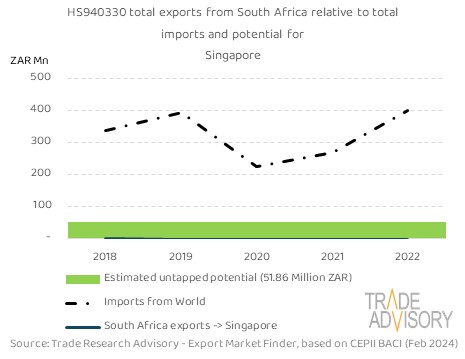This report contains a summary snapshot of outcomes for the exports of HS940330 to Singapore from the perspective of the home market (South Africa). More technical detail is available on request from Trade Research Advisory.