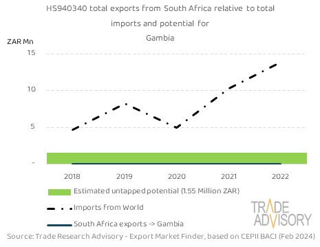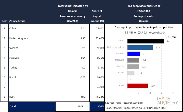 This report contains a summary snapshot of outcomes for the exports of HS940340 to Gambia from the perspective of the home market (South Africa). More technical detail is available on request from Trade Research Advisory.