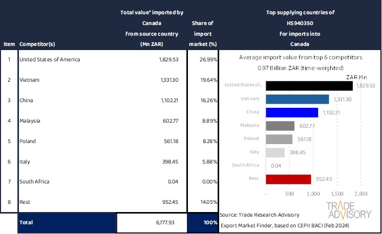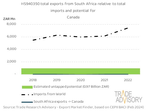 This report contains a summary snapshot of outcomes for the exports of HS940350 to Canada from the perspective of the home market (South Africa). More technical detail is available on request from Trade Research Advisory.