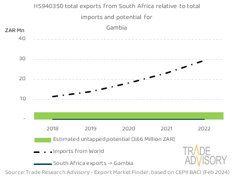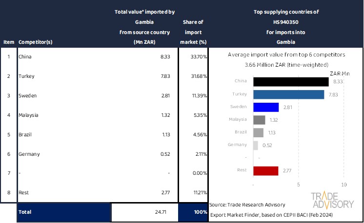 This report contains a summary snapshot of outcomes for the exports of HS940350 to Gambia from the perspective of the home market (South Africa). More technical detail is available on request from Trade Research Advisory.
