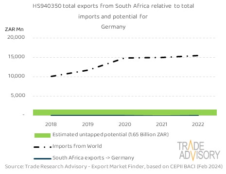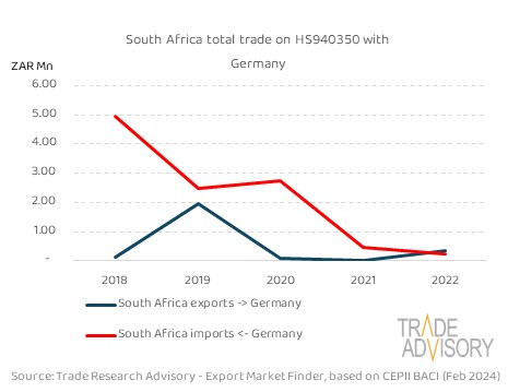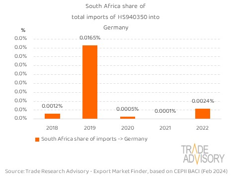This report contains a summary snapshot of outcomes for the exports of HS940350 to Germany from the perspective of the home market (South Africa). More technical detail is available on request from Trade Research Advisory.