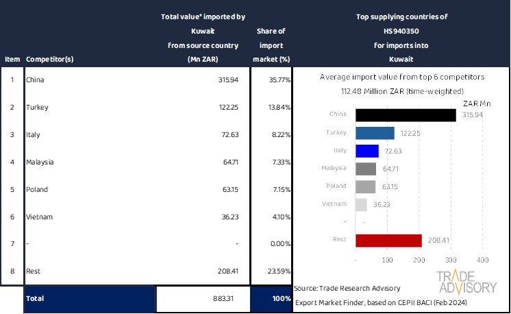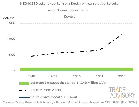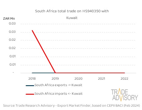 This report contains a summary snapshot of outcomes for the exports of HS940350 to Kuwait from the perspective of the home market (South Africa). More technical detail is available on request from Trade Research Advisory.