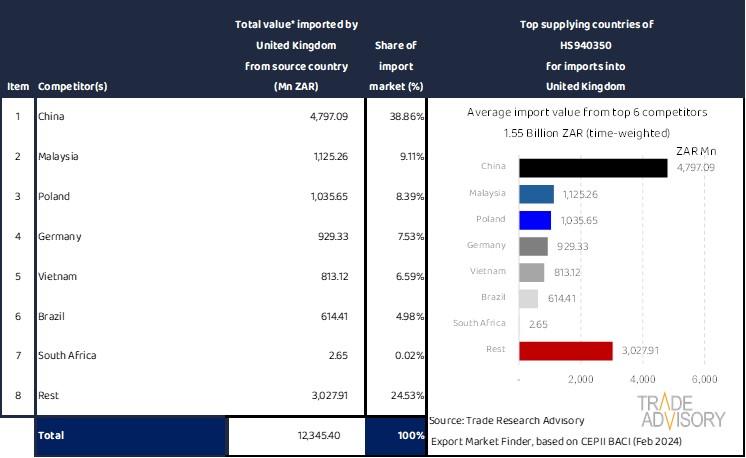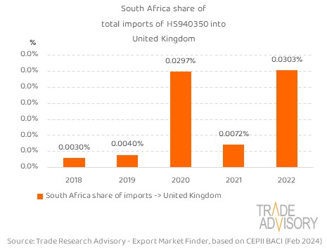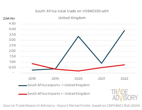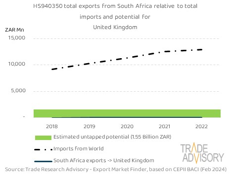 This report contains a summary snapshot of outcomes for the exports of HS940350 to United Kingdom from the perspective of the home market (South Africa). More technical detail is available on request from Trade Research Advisory.