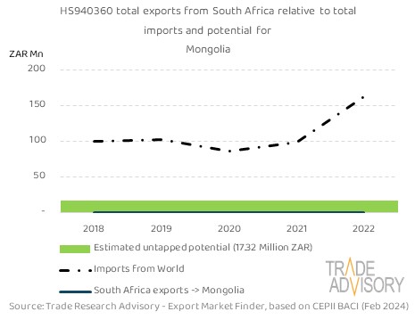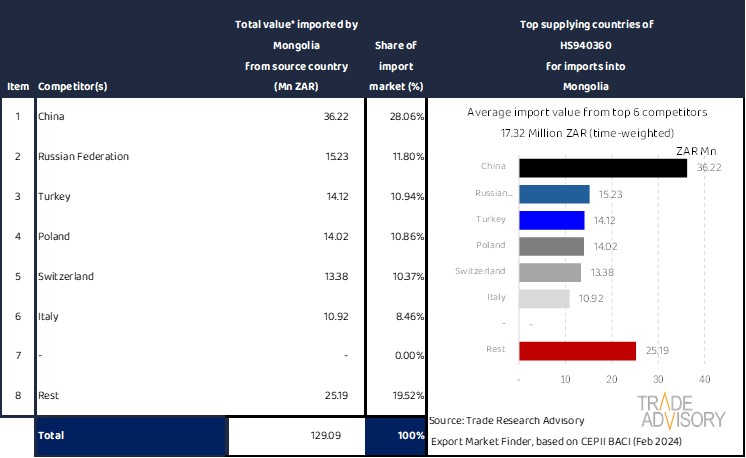 This report contains a summary snapshot of outcomes for the exports of HS940360 to Mongolia from the perspective of the home market (South Africa). More technical detail is available on request from Trade Research Advisory.