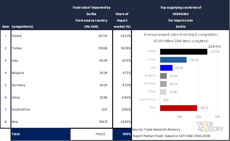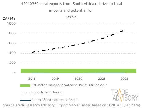 This report contains a summary snapshot of outcomes for the exports of HS940360 to Serbia from the perspective of the home market (South Africa). More technical detail is available on request from Trade Research Advisory.