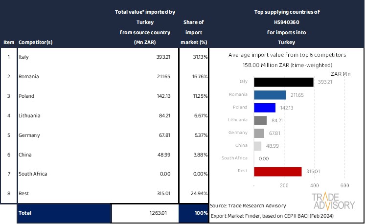 This report contains a summary snapshot of outcomes for the exports of HS940360 to Turkey from the perspective of the home market (South Africa). More technical detail is available on request from Trade Research Advisory.
