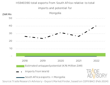 This report contains a summary snapshot of outcomes for the exports of HS940390 to Mongolia from the perspective of the home market (South Africa). More technical detail is available on request from Trade Research Advisory.