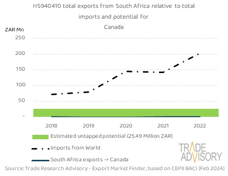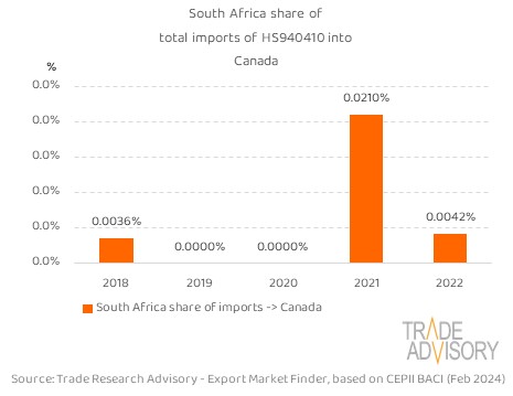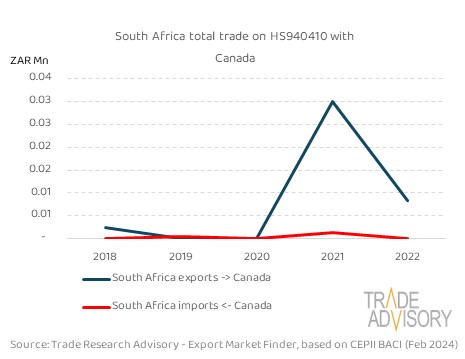 This report contains a summary snapshot of outcomes for the exports of HS940410 to Canada from the perspective of the home market (South Africa). More technical detail is available on request from Trade Research Advisory.