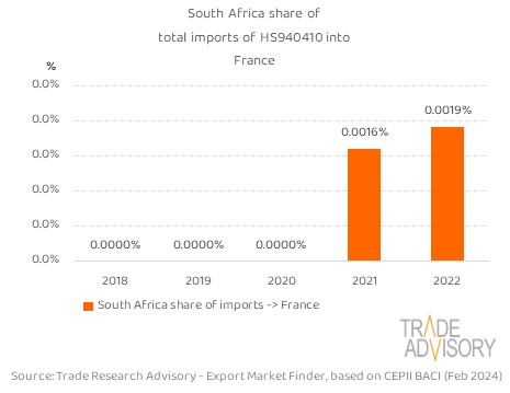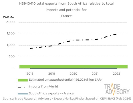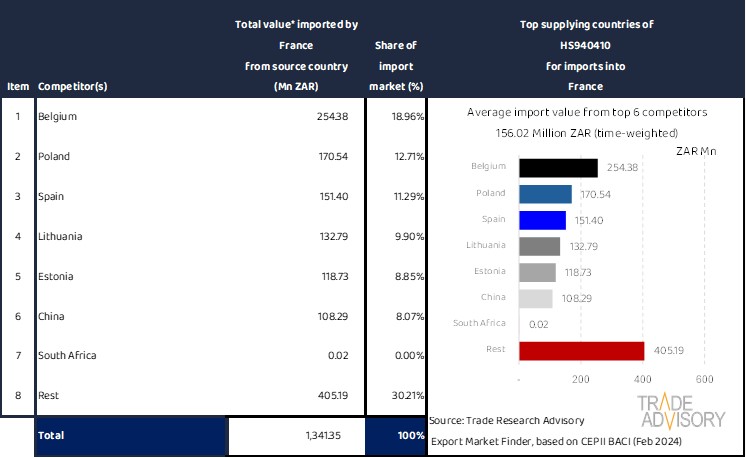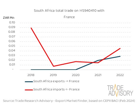 This report contains a summary snapshot of outcomes for the exports of HS940410 to France from the perspective of the home market (South Africa). More technical detail is available on request from Trade Research Advisory.
