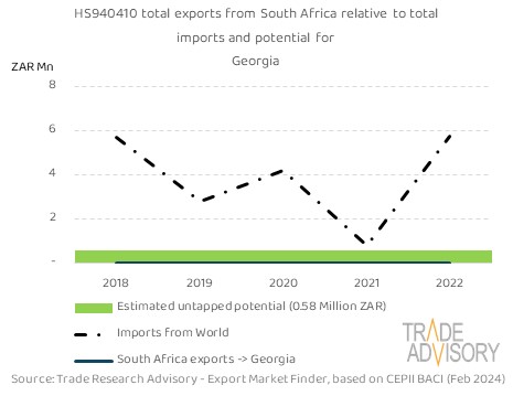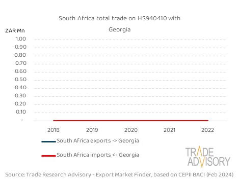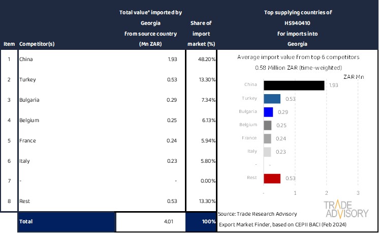 This report contains a summary snapshot of outcomes for the exports of HS940410 to Georgia from the perspective of the home market (South Africa). More technical detail is available on request from Trade Research Advisory.