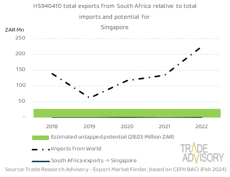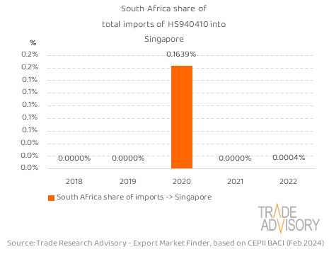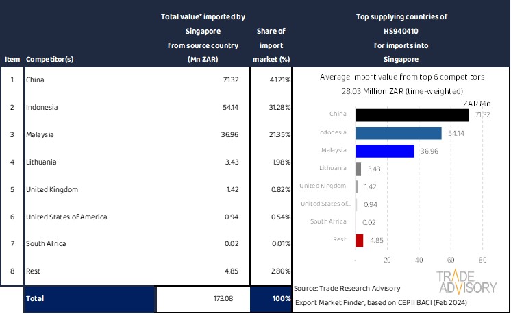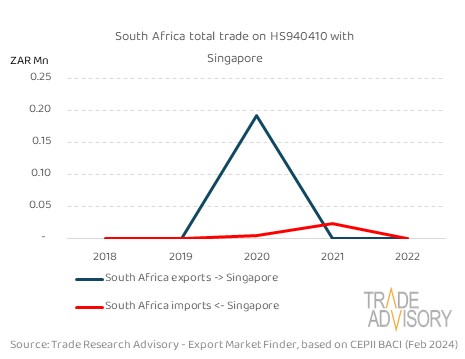 This report contains a summary snapshot of outcomes for the exports of HS940410 to Singapore from the perspective of the home market (South Africa). More technical detail is available on request from Trade Research Advisory.