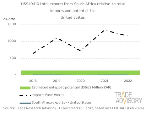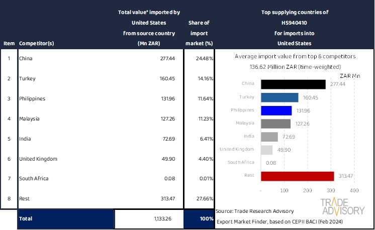 This report contains a summary snapshot of outcomes for the exports of HS940410 to United States from the perspective of the home market (South Africa). More technical detail is available on request from Trade Research Advisory.