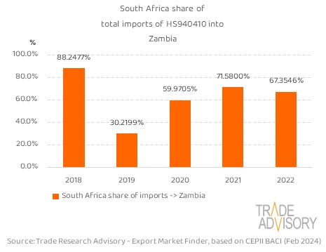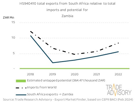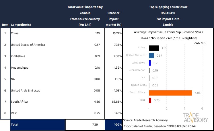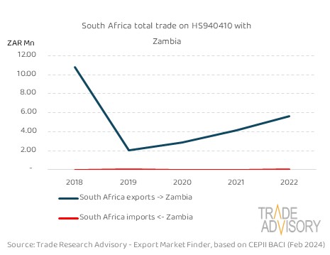 This report contains a summary snapshot of outcomes for the exports of HS940410 to Zambia from the perspective of the home market (South Africa). More technical detail is available on request from Trade Research Advisory.