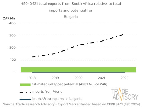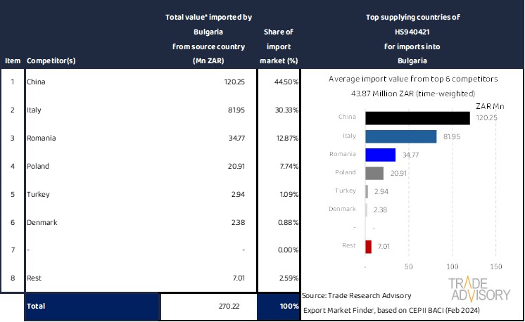 This report contains a summary snapshot of outcomes for the exports of HS940421 to Bulgaria from the perspective of the home market (South Africa). More technical detail is available on request from Trade Research Advisory.