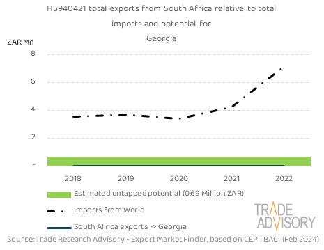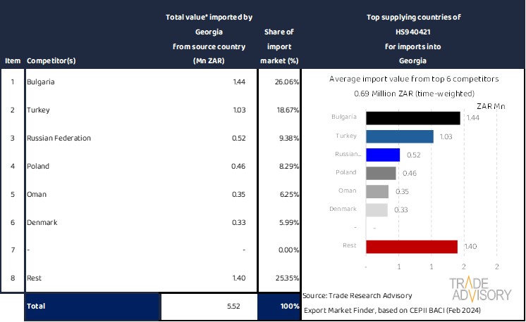 This report contains a summary snapshot of outcomes for the exports of HS940421 to Georgia from the perspective of the home market (South Africa). More technical detail is available on request from Trade Research Advisory.