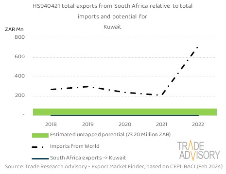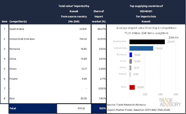 This report contains a summary snapshot of outcomes for the exports of HS940421 to Kuwait from the perspective of the home market (South Africa). More technical detail is available on request from Trade Research Advisory.