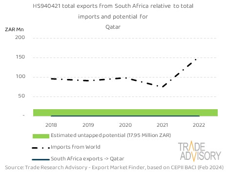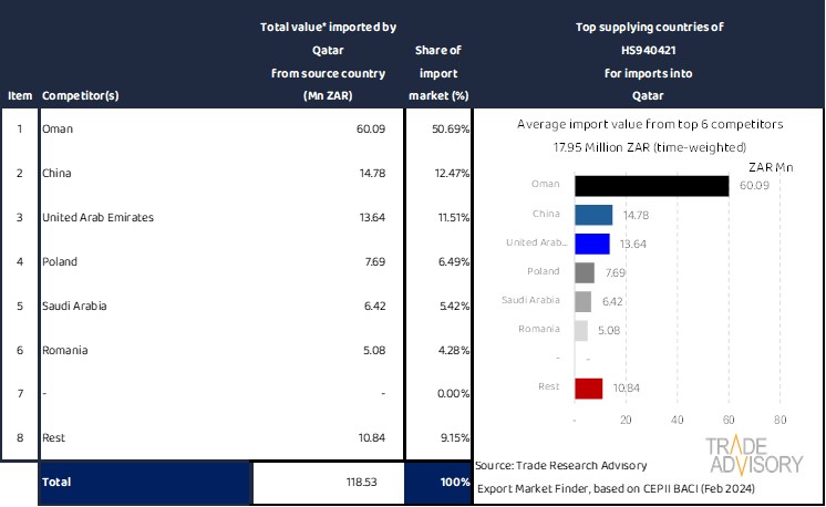 This report contains a summary snapshot of outcomes for the exports of HS940421 to Qatar from the perspective of the home market (South Africa). More technical detail is available on request from Trade Research Advisory.
